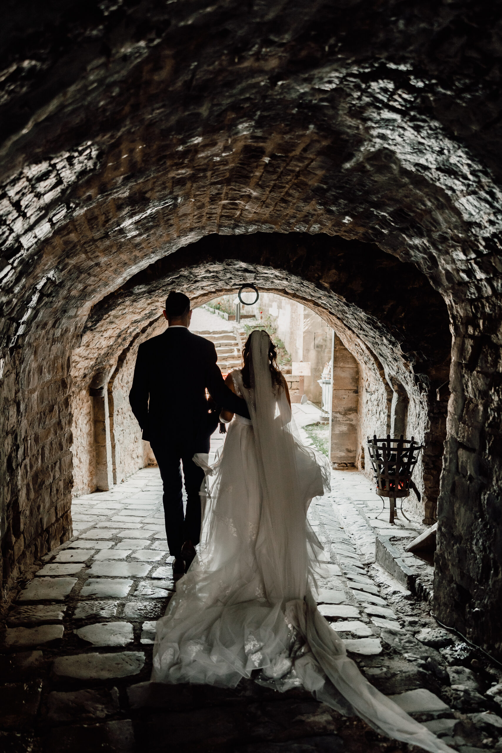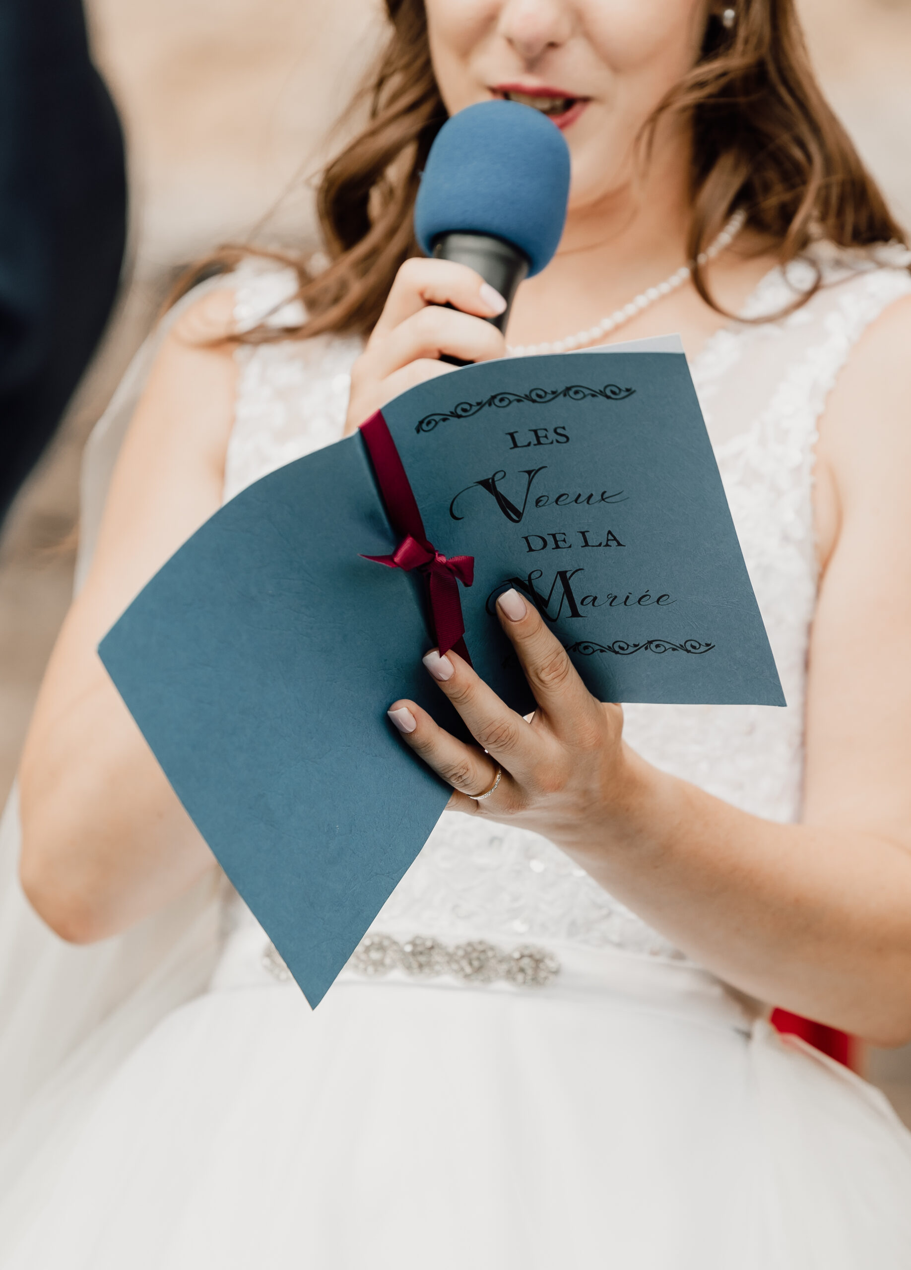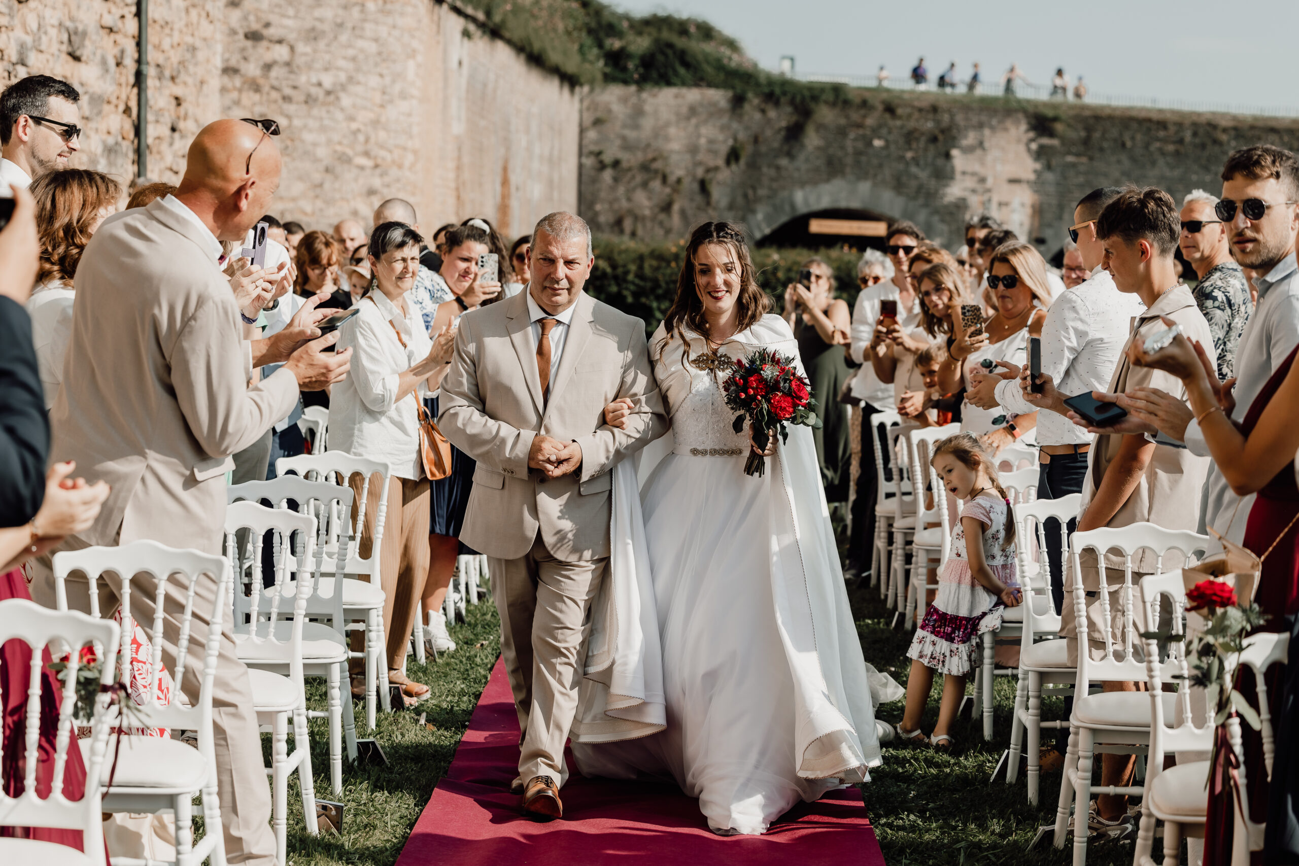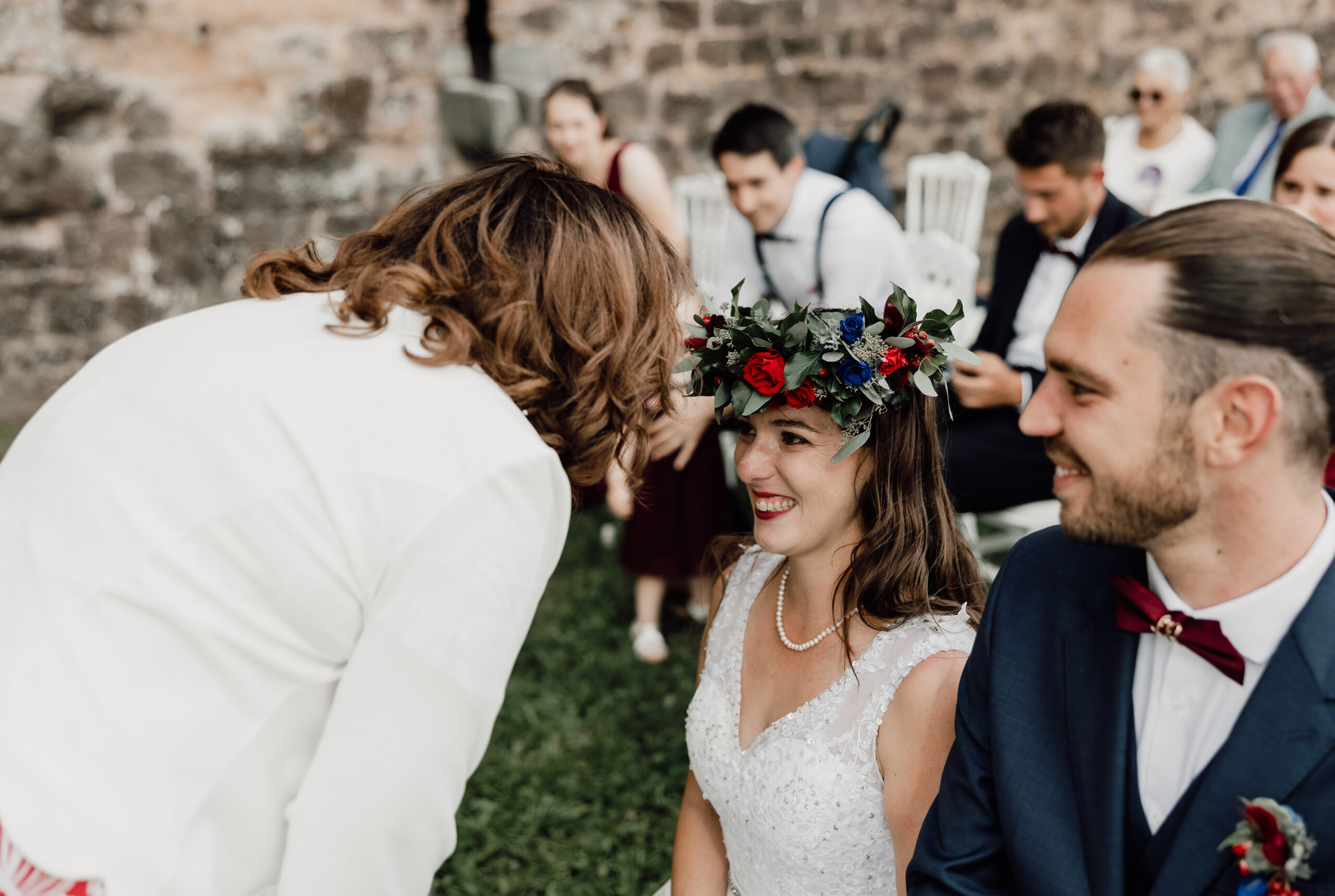 Pour sublimer ce moment hors du temps, nous avons eu la chance d’avoir un officiant extraordinaire, qui a su insuffler à la cérémonie une véritable âme en lien avec l’histoire du château. Il a conçu un rituel inspiré des nobles traditions médiévales, mettant à l’honneur les matières précieuses et les symboles royaux. Grâce à lui, chaque geste, chaque parole avait du sens, transformant cette cérémonie en un moment solennel et inoubliable. Ils ont imaginé cette cérémonie en y ajoutant des éléments qui avaient du sens pour eux : des vœux écrits sur du parchemin, une cape spécialement réalisée, assortie à la robe de Justine, elle aussi réalisée selon ses propres idées. Voir leurs yeux briller et leur fierté d’avoir osé était ma plus belle récompense.